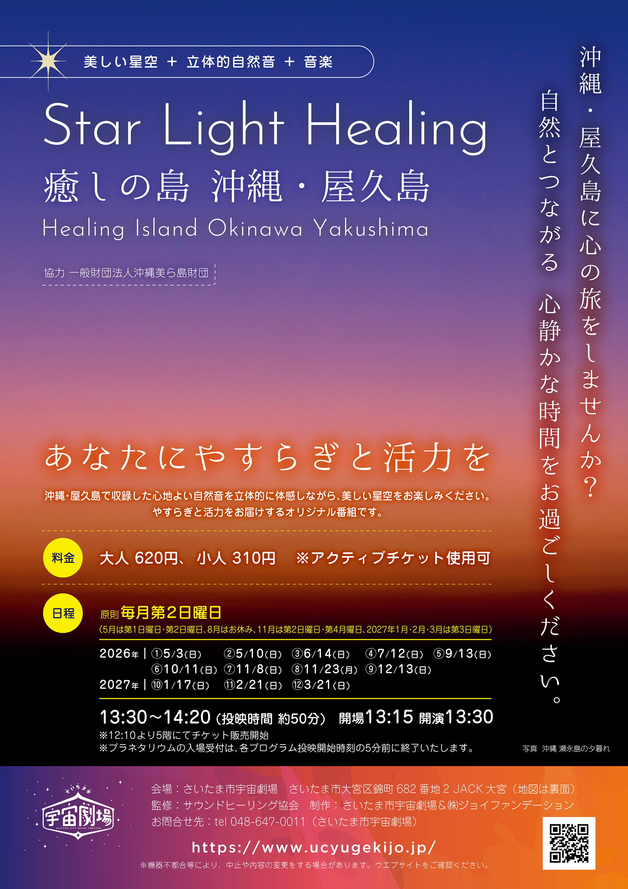 さいたま市宇宙劇場とサウンドヒーリング協会のコラボレーションで「やすらぎと活力」をお届けするプラネタリウムオリジナル番組です。沖縄諸島・屋久島で収録した自然の音を立体的に楽しみながら、美しい星空+音楽+スライド映像のナビゲートでお届けする自然とつながる「心の旅」です。